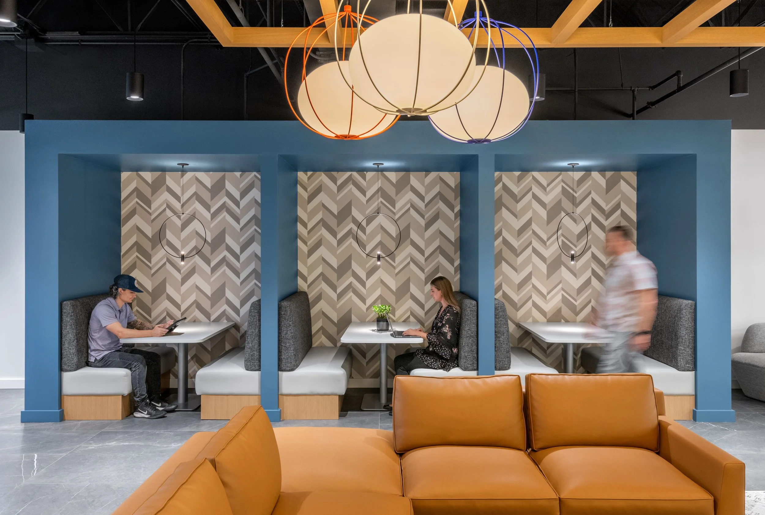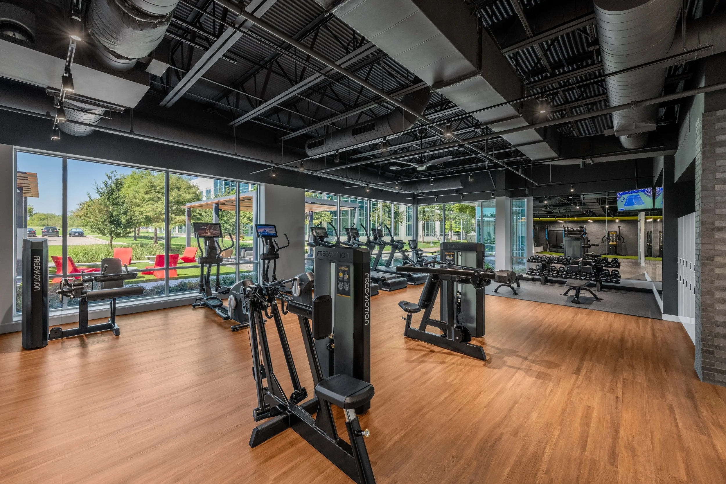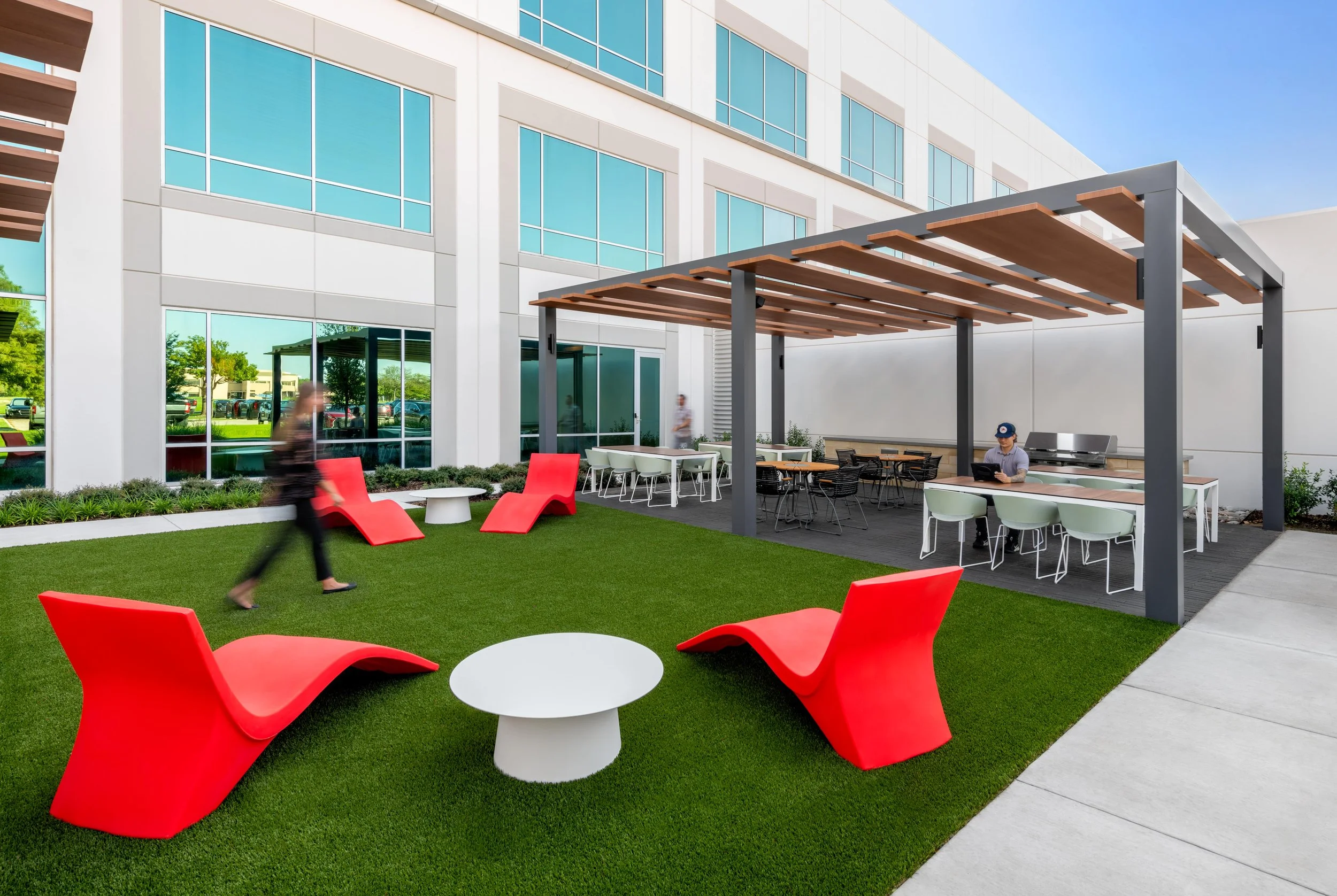 The renovation focused on high-impact shared spaces including the lobby, gym, conference center, café, and an all-new outdoor patio with a shaded pergola. These updates modernized the look and feel of the property while creating moments of hospitality throughout the tenant experience.