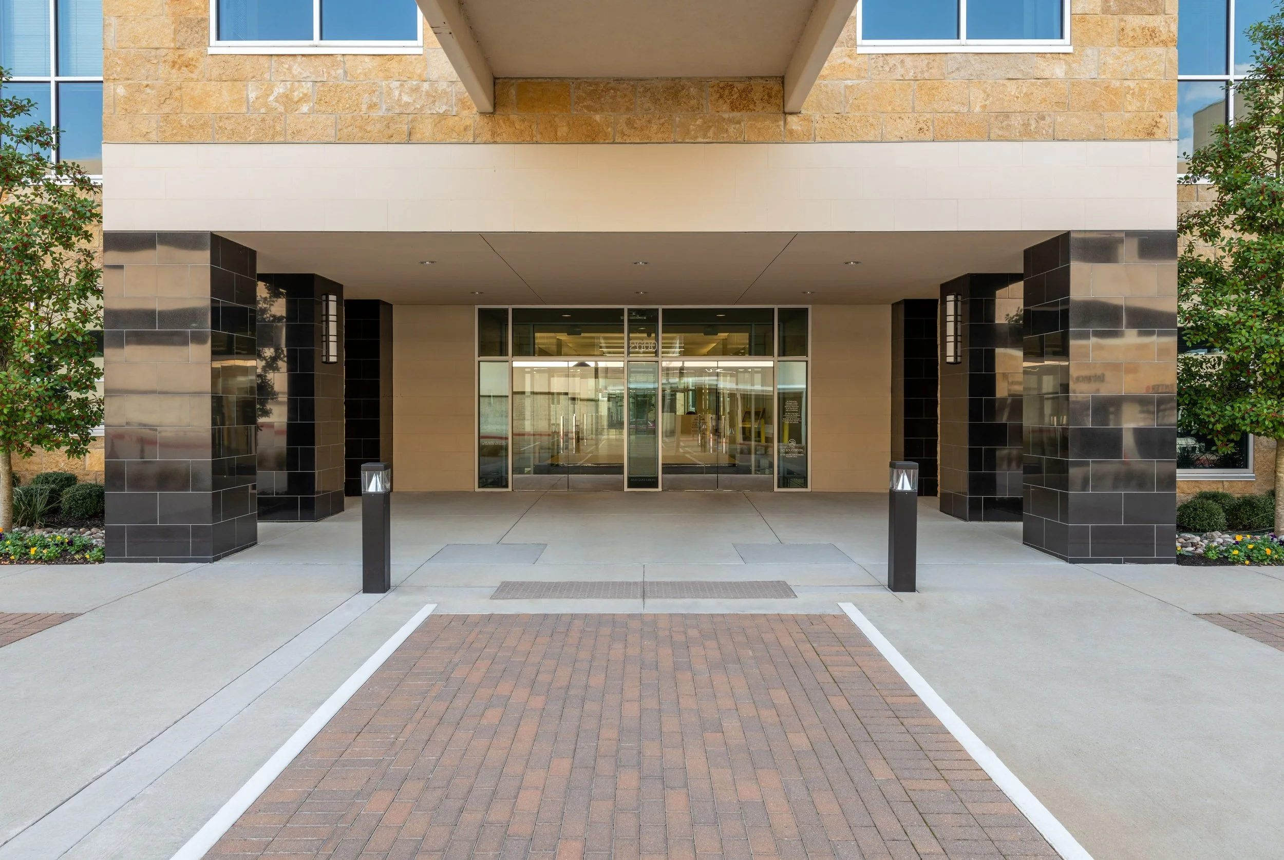 The main lobby was completely reimagined with new gypsum ceilings featuring linear pendant and cove lighting, backlit perforated metal panels with a cloud motif, white porcelain tile flooring, a modern security desk, and fully updated restrooms. Exterior upgrades included repositioned structural columns for a more inviting entry, illuminated bollards, patterned concrete paving, and five-foot vertical monitors to enhance visibility and branding.