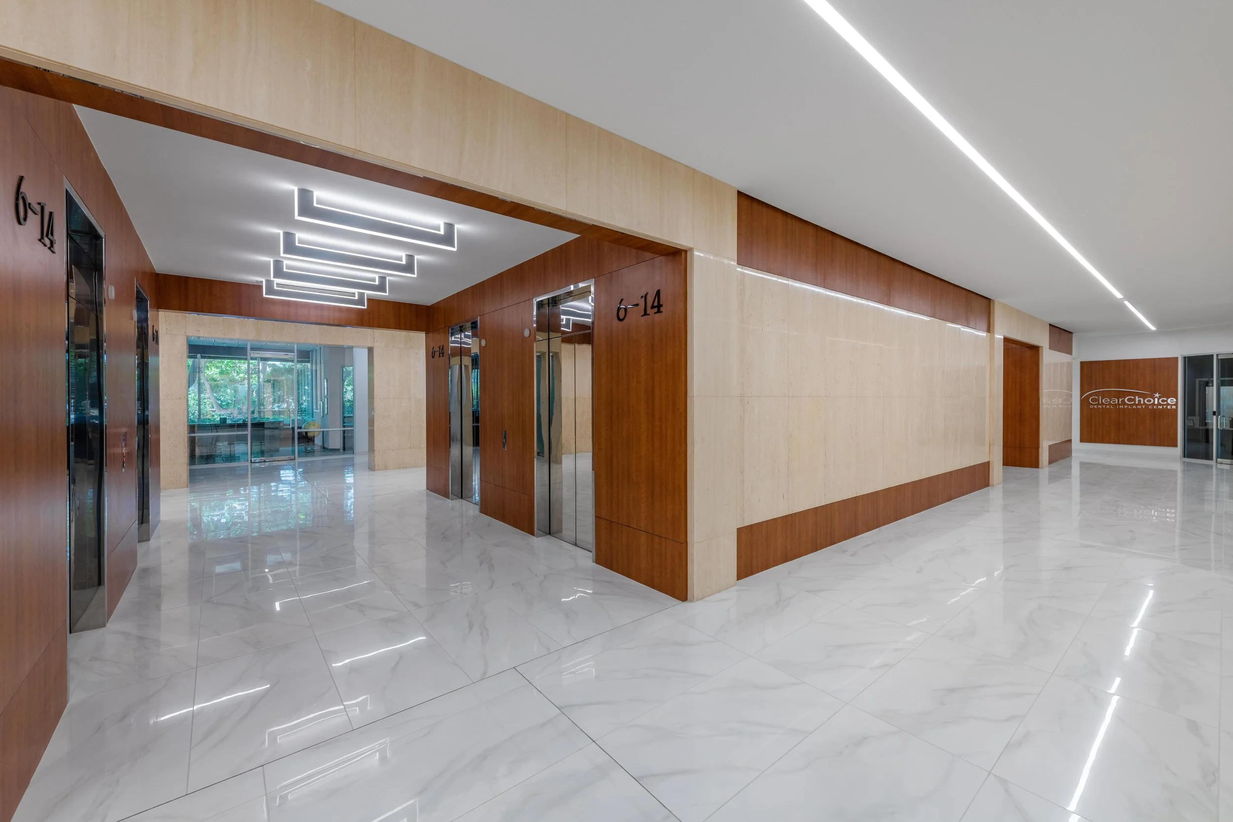 The lobby overhaul included the removal of existing stone flooring and plaster ceilings, replaced with high-gloss porcelain tile, refined gyp ceilings, recessed linear lighting, and a custom security desk. Original limestone and mahogany wall panels were salvaged, repaired, and seamlessly reintegrated, adding richness to the updated space. A new tenant lounge just inside the entry features sculptural ceiling elements, layered lighting, and a striking stone-clad wall with a 10’ opti-myst fireplace.