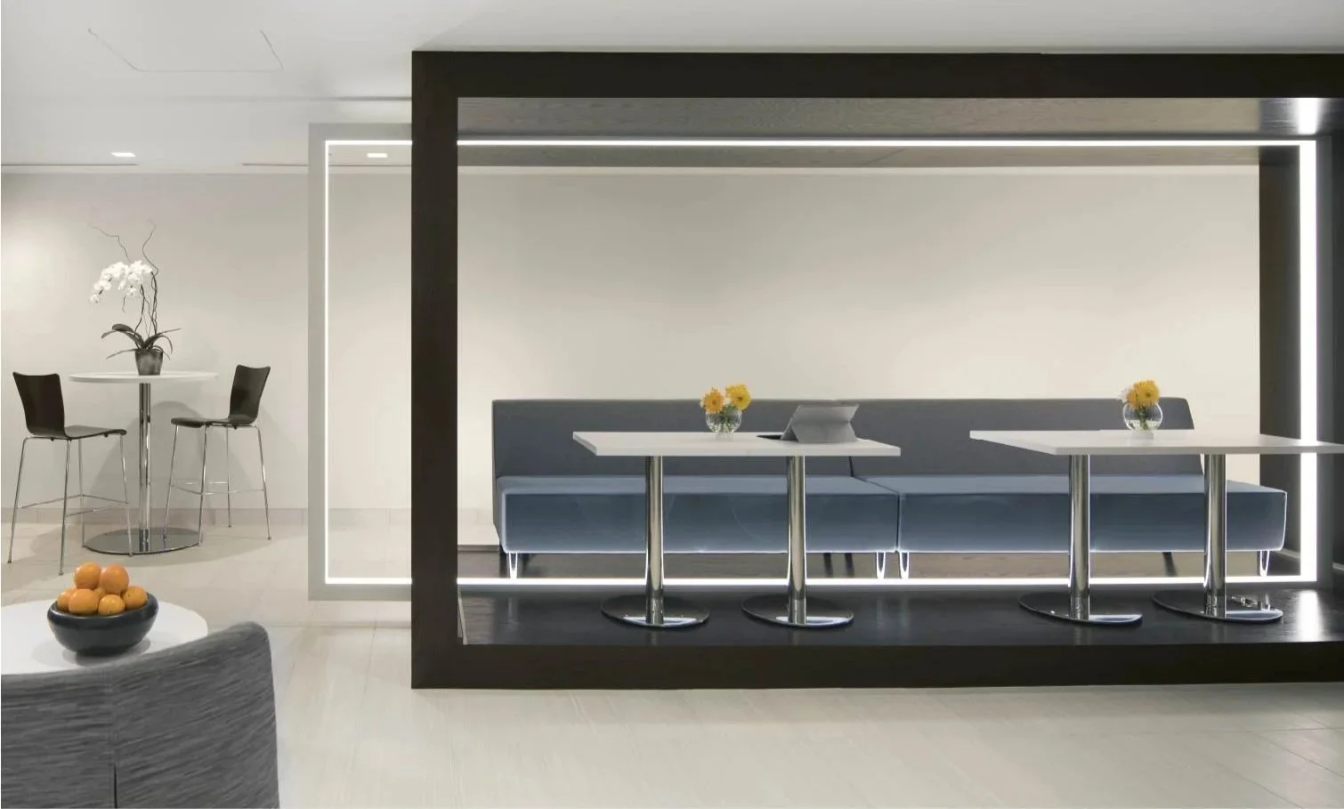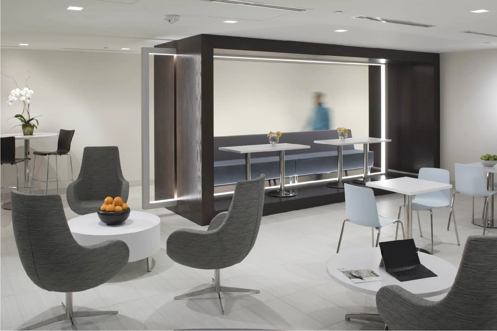 We brought the design team’s vision to life with a new tenant lounge featuring an adjacent café. The lounge includes new porcelain tile flooring, backlit perforated metal ceiling panels recessed in gypsum perimeters, specialty lighting, white oak portals, banquette seating with a 3-Form backdrop, and shared dining areas. Contemporary furniture, fresh finishes, and thoughtful lighting elements create a welcoming, hospitality-inspired environment.