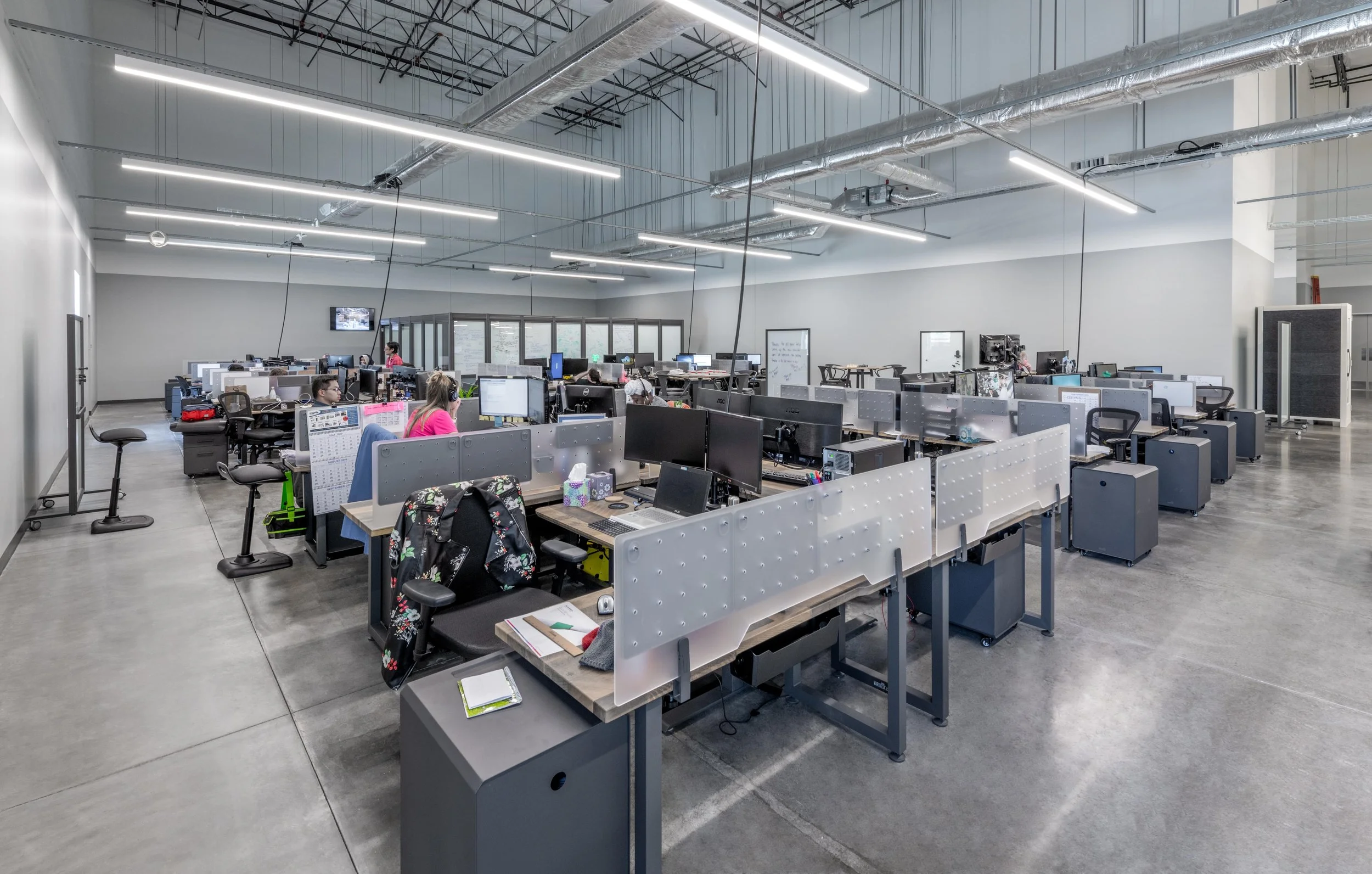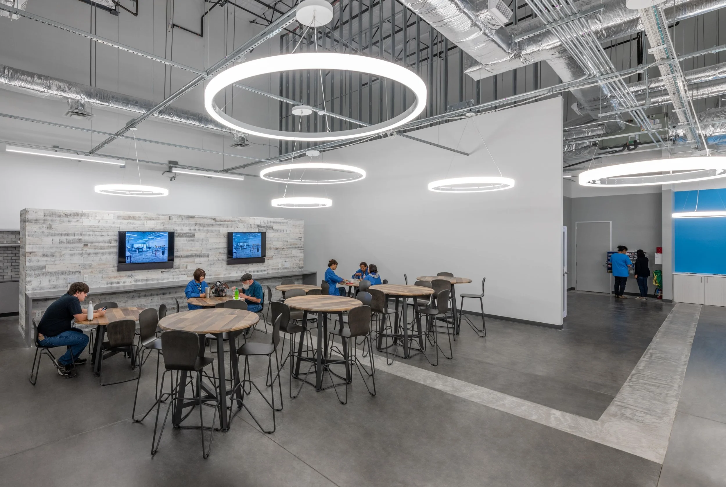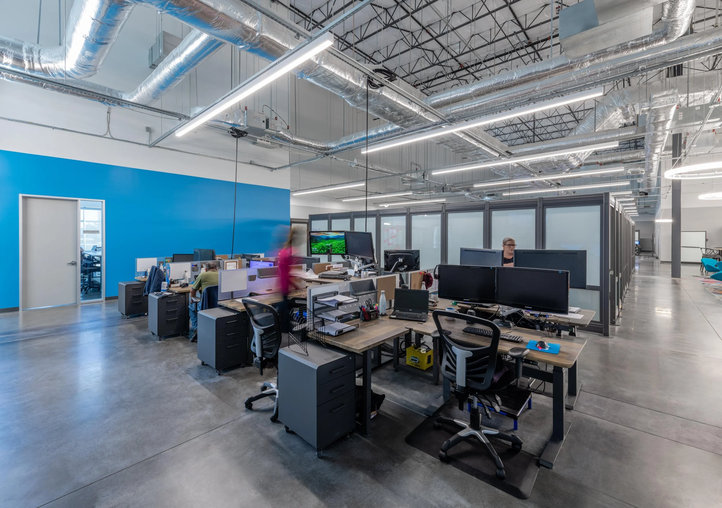 The project included custom infrastructure solutions,such as powered movable furniture, compressed air piping, and a grid-based system to support future telecom and electrical needs,designed to keep the space agile as the company grows. Glass office fronts and collaborative lounge areas foster openness while meeting functional production needs.