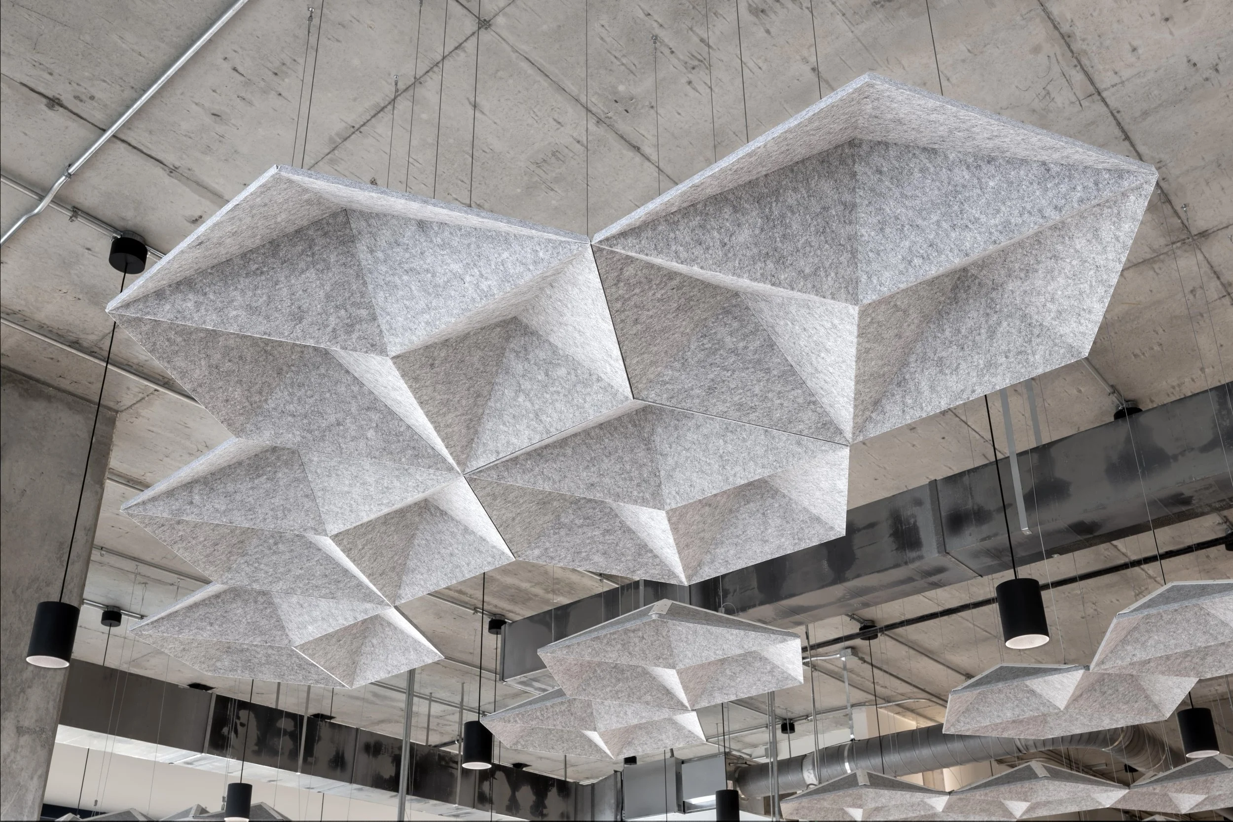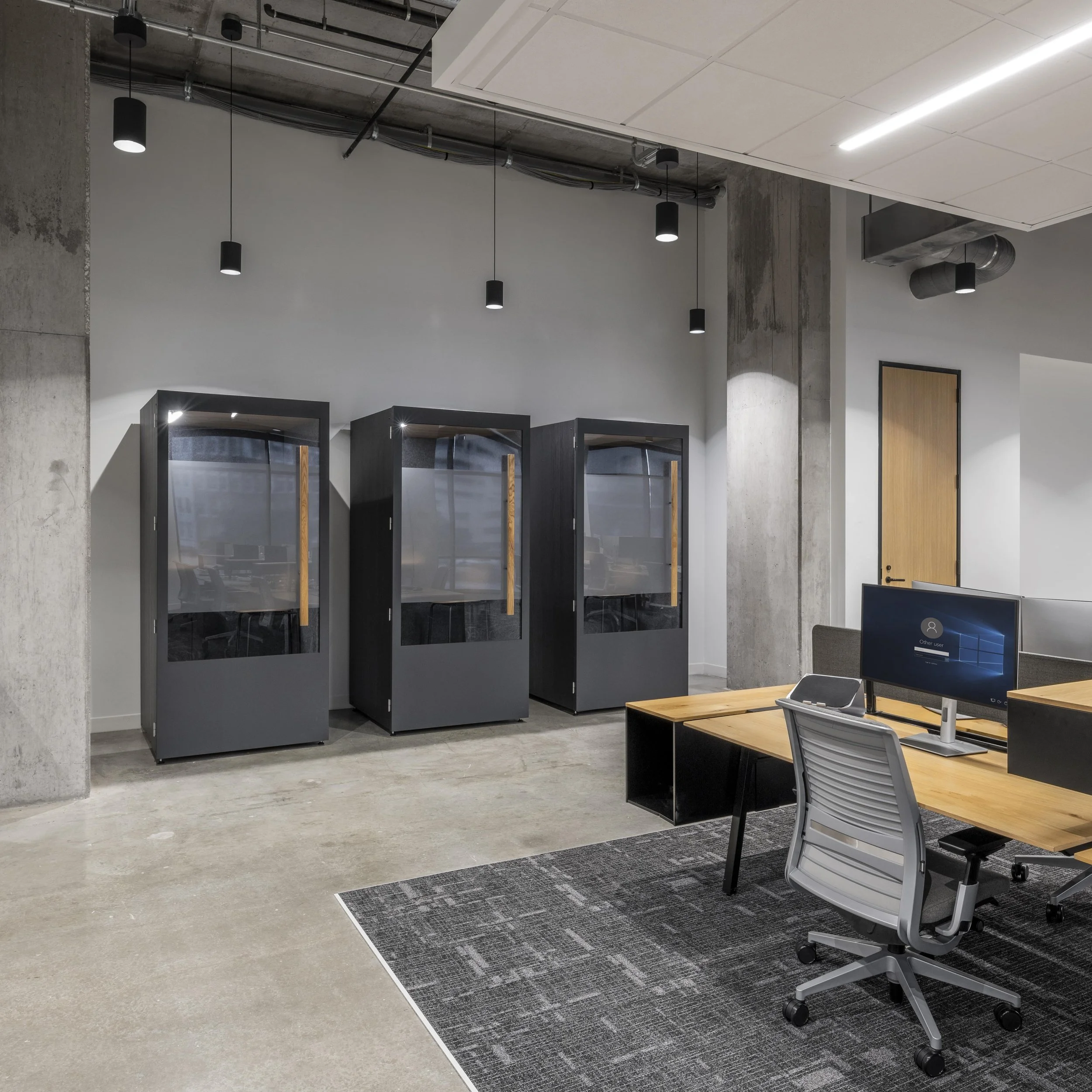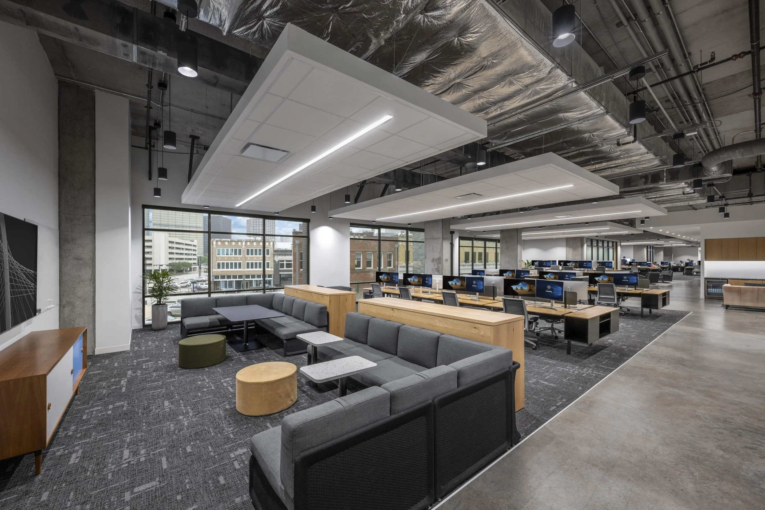 The space features high ceilings, exposed mechanicals, and polished concrete floors, softened by warm wood finishes, custom oak slat walls, and plush seating throughout. Acoustic Arktura baffles in the breakroom and felt slats in the conference areas were installed to minimize sound in the open-concept layout, while feature lighting was used to create visual rhythm and define zones without partitions.