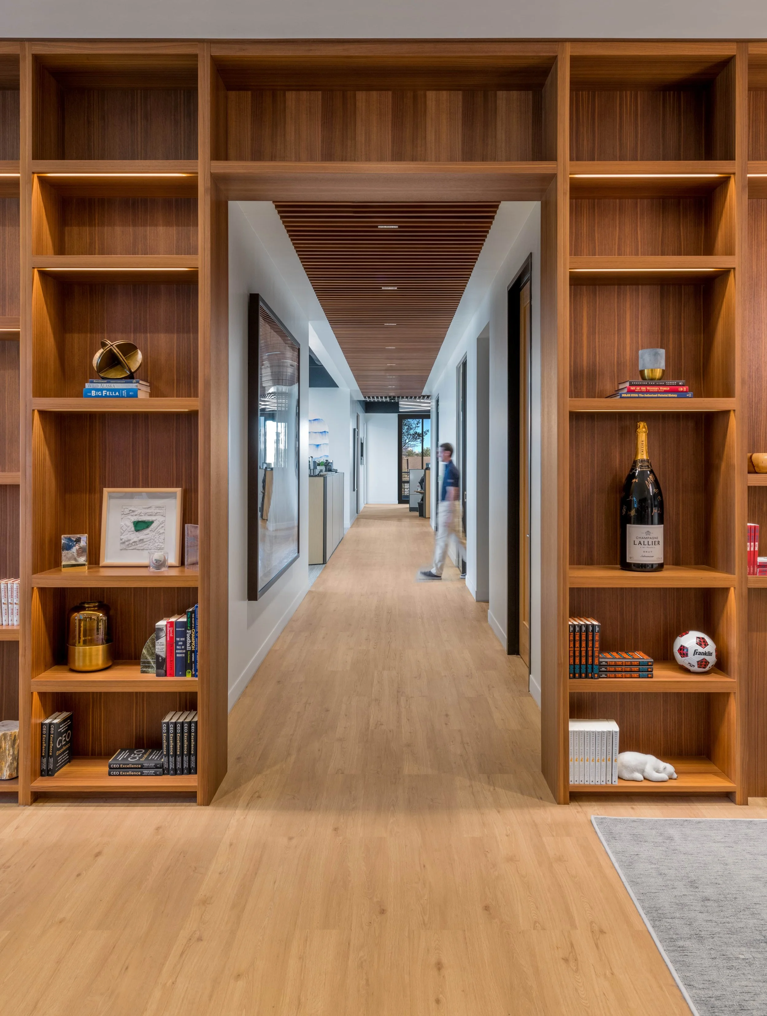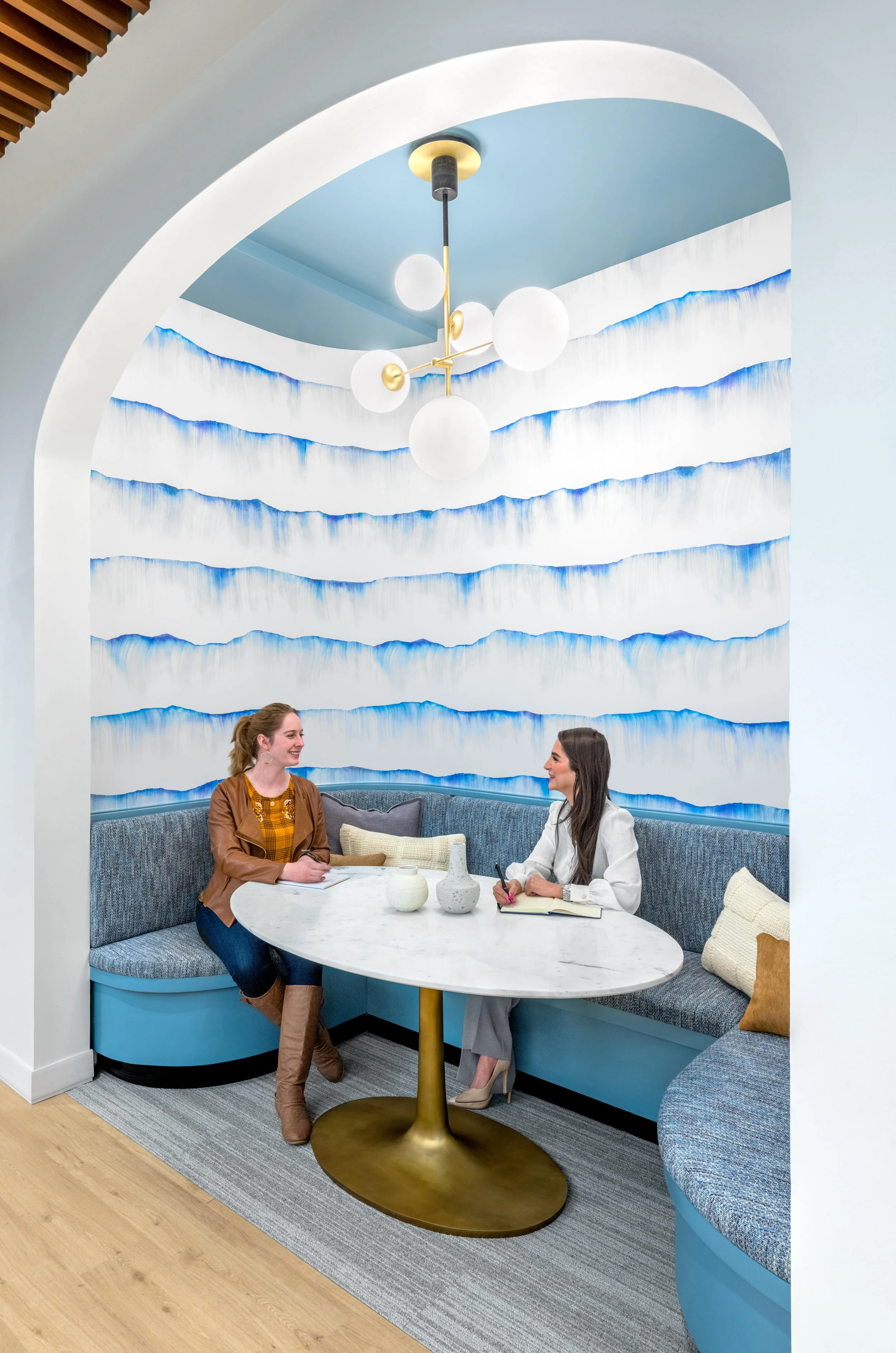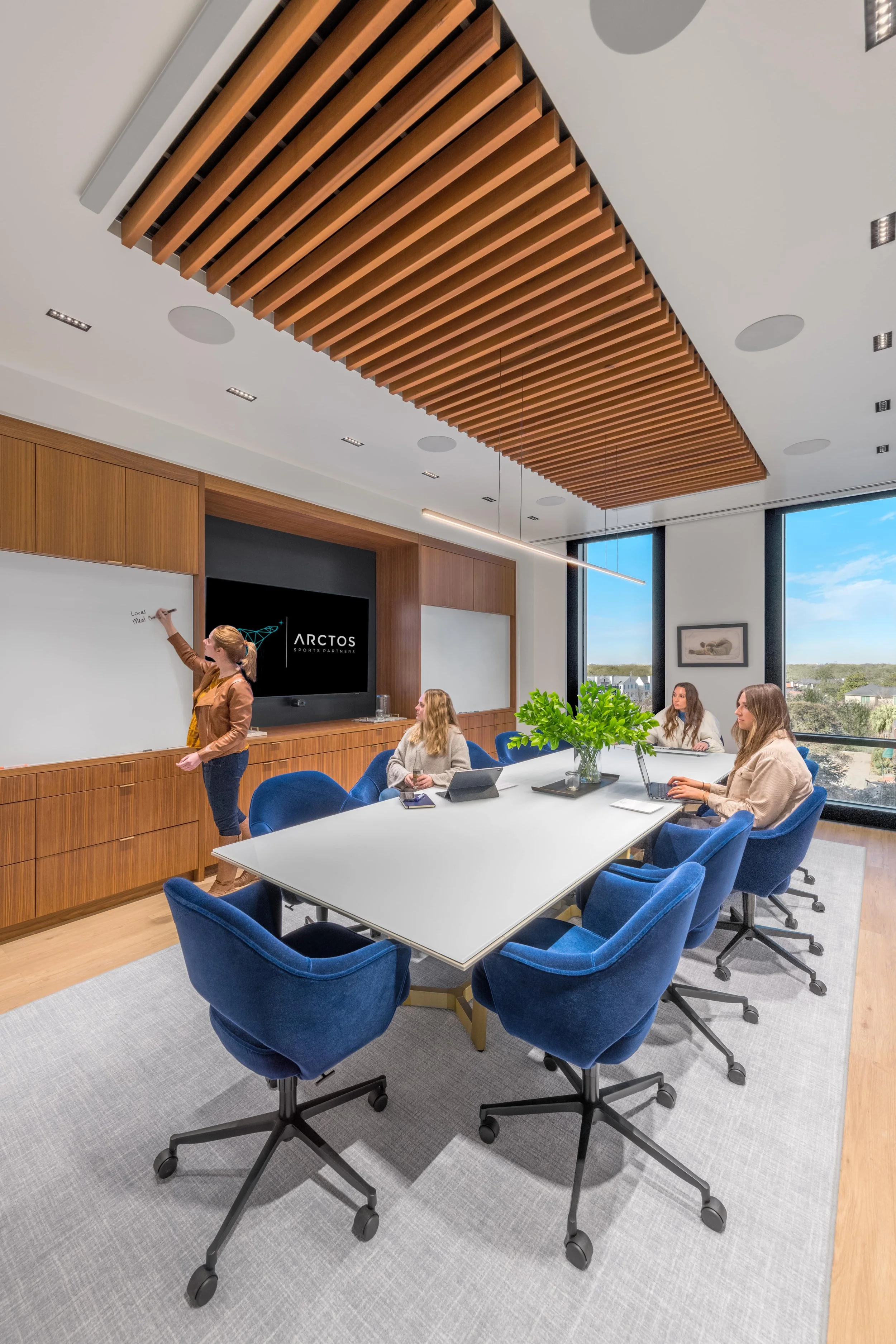 Originally spanning over 11,000 square feet, the Arctos office was later expanded by an additional 3,000 square feet to accommodate continued growth. The design pairs clean architecture with personality-rich elements: moody materials, layered textures, bold acoustic treatments, and curated moments of color. The result is a space that feels elevated without being overdone.