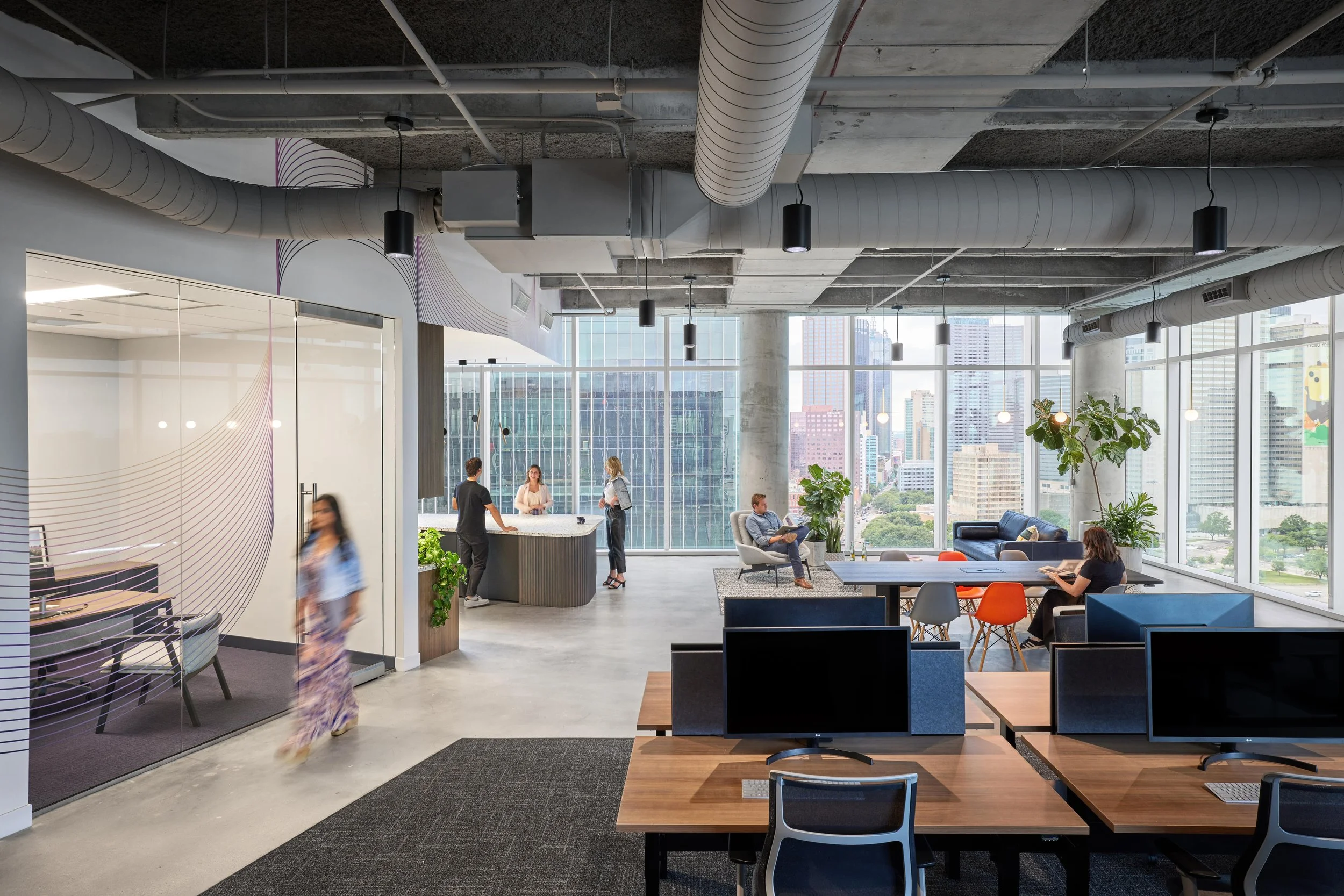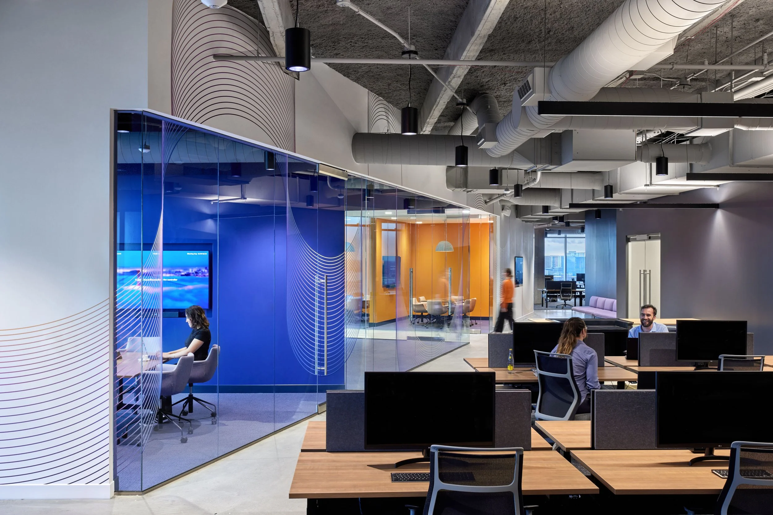 Exposed concrete ceilings, layered acoustics, and graphic glass walls set the tone for a flexible, open office that balances creativity with clarity. From the vivid meeting rooms to the relaxed breakout areas and custom café bar, every detail was designed to support teamwork, focus, and flow.