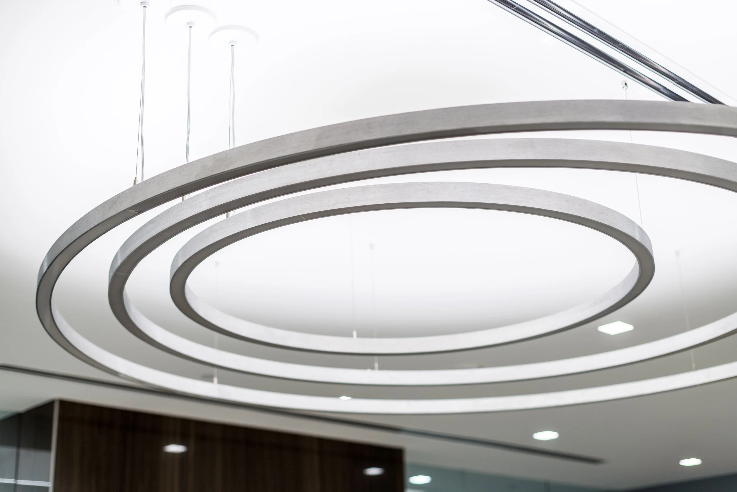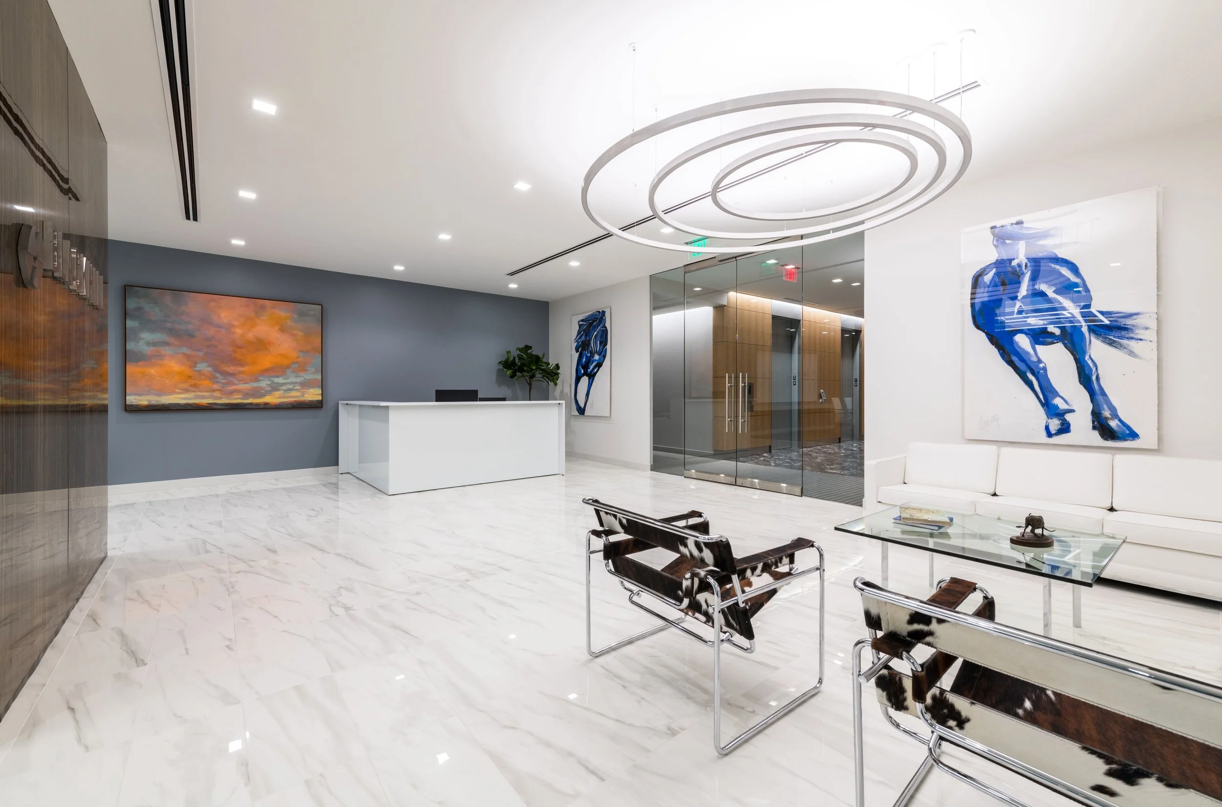 The resulting interior is refined and contemporary, with crisp white stone flooring, glass office fronts, and carefully layered lighting. Polished finishes and sculptural furniture give the space a clean, elevated feel complementing the firm's sophisticated brand and discreet presence.
