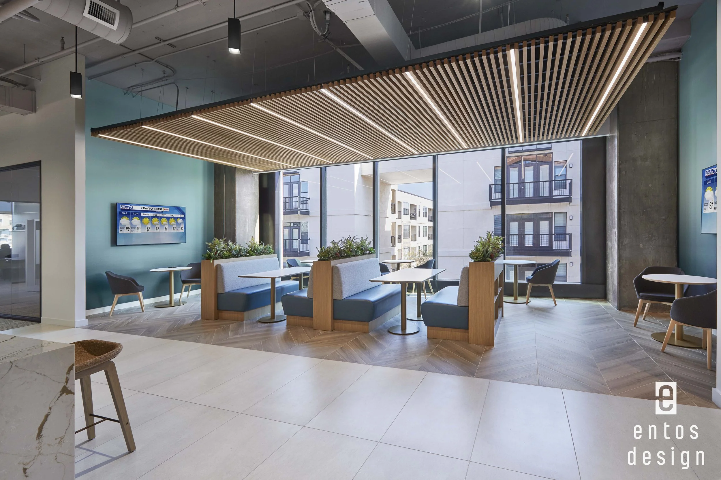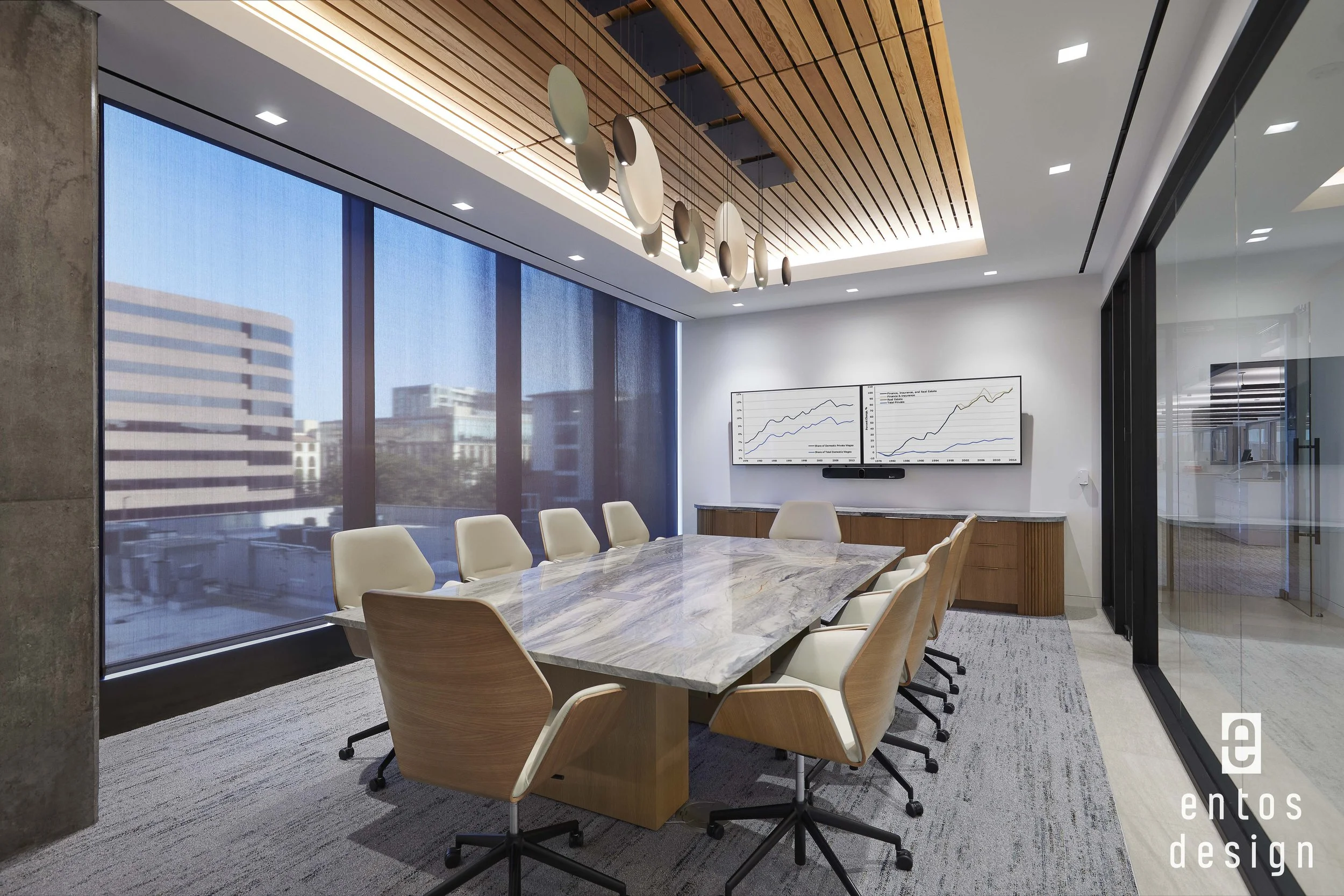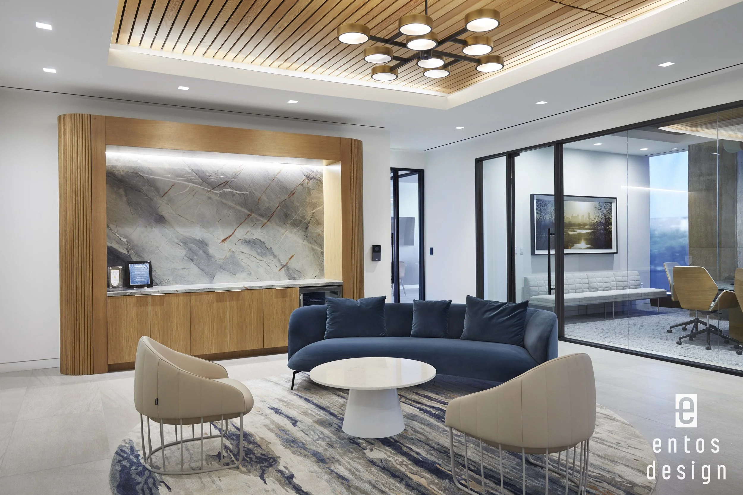 HRNCIR Construction worked closely with ENTOS Design to execute the project, coordinating construction within one of Dallas’s most sought-after developments. Working within The Quad required alignment with building standards and ongoing coordination with the shell general contractor while maintaining the design intent throughout. Feature ceiling elements with integrated lighting, large-format stone, and custom millwork are just some of the key features that make this space appealing. The layout marries a range of spaces, from client-facing conference rooms to open work areas and amenity spaces, each delivered with a distinct level of finish and attention to detail.