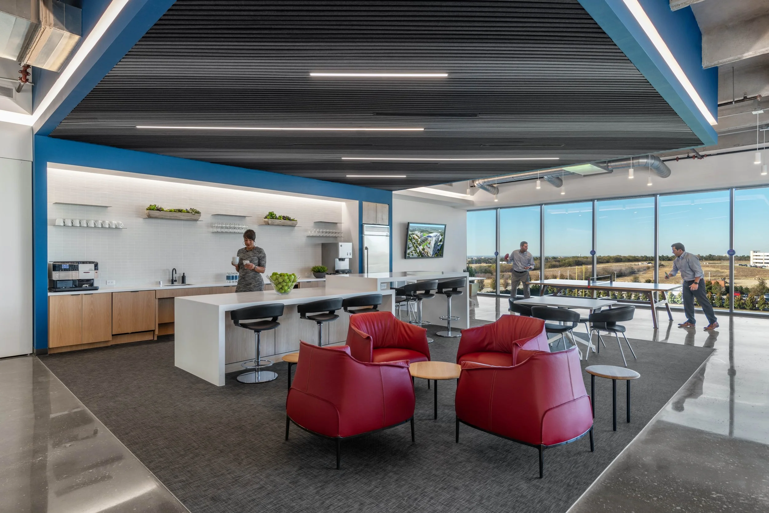 To bring the company’s culture to life, the design team introduced a hospitality-driven breakroom tailored for entertaining. Built to host Monday Night Football watch parties, the space includes a custom acoustical ceiling to manage sound and add visual interest. Lounge seating, bar-height tables, and a full kitchen make it feel more like a modern social club than a traditional break area.