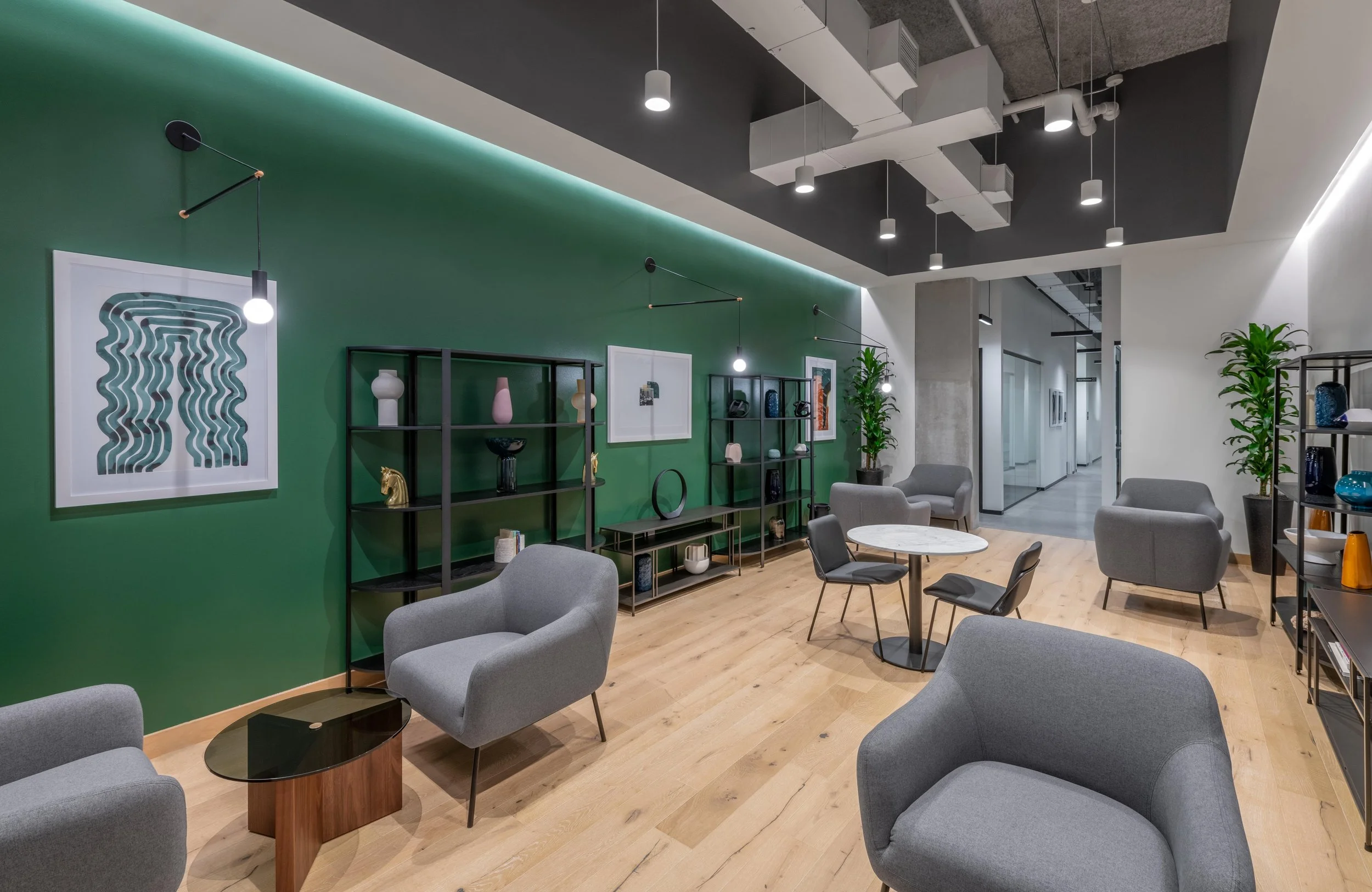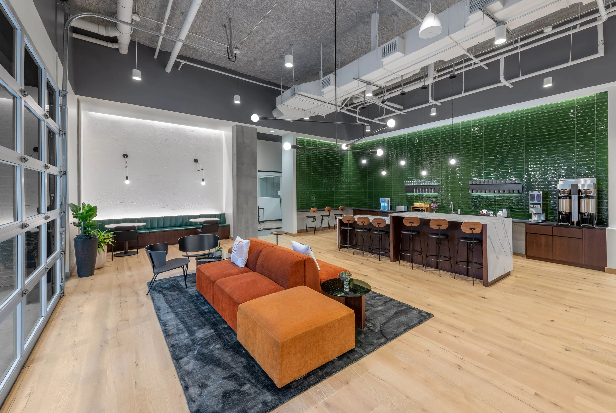 From the sleek glass office fronts to the moody green tile-lined café, every detail reflects the Industrious standard of hospitality-driven workplace design. HRNCIR delivered the project on a fast-paced schedule with minimal disruption, building a space that’s as functional as it is refined.