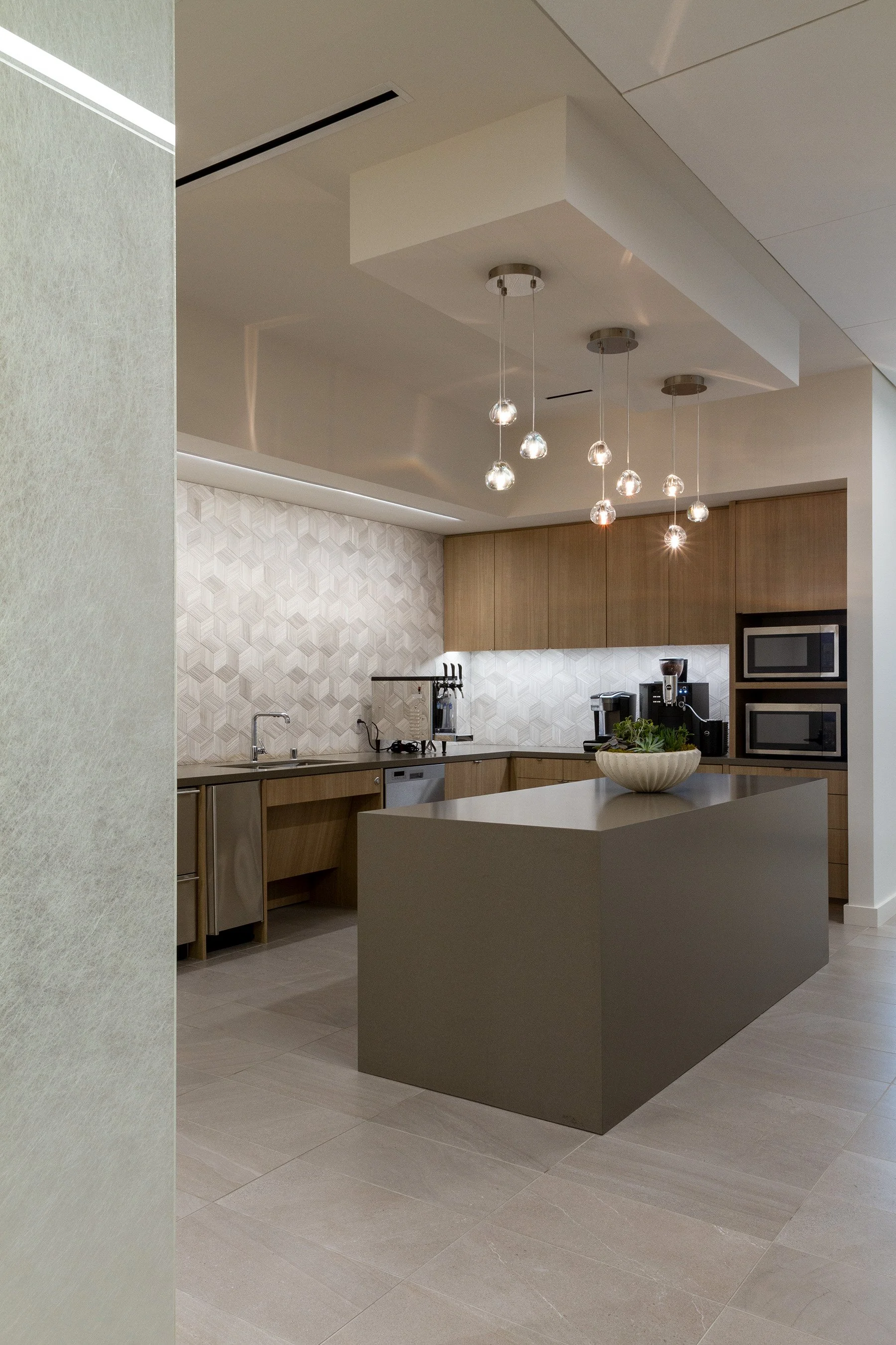 A library adjacent to reception creates a comfortable arrival point, while open standing areas and multipurpose rooms were carefully programmed to host meetings and events with ease. Casual lounge seating in the boardroom and a break room designed to double as workspace reflect a softer, more flexible approach to the workday. Throughout, finishes like Venetian plaster, neutral tile, glass, and richly toned woodwork provide a gallery-like setting for the client’s extensive art collection.