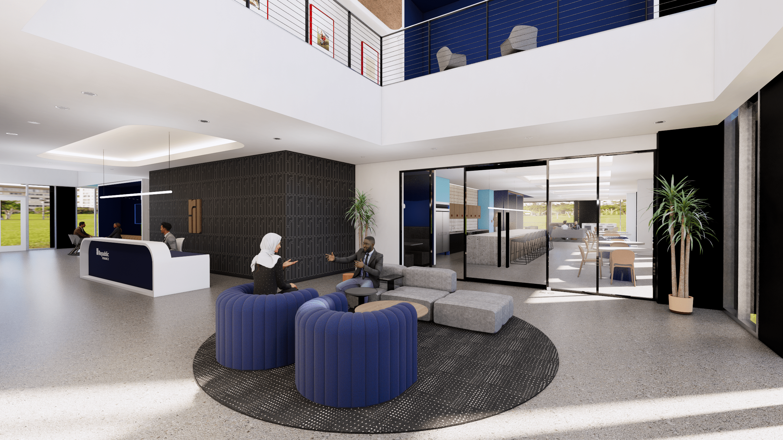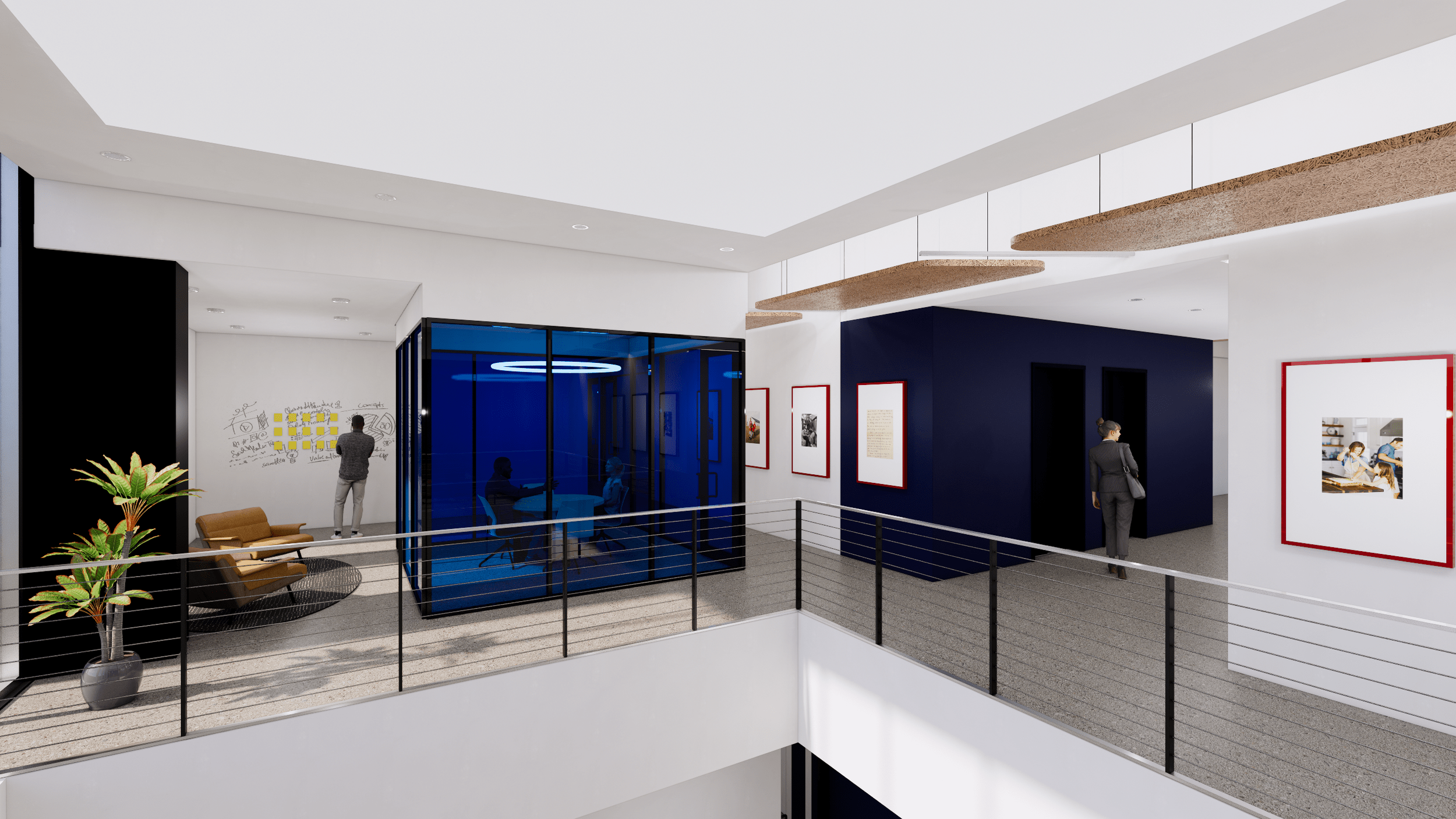 The first floor houses an open workstation layout, breakout rooms, and a vibrant café that opens to a landscaped outdoor space. The second floor includes assembly rooms for training and client services, and is anchored by a monumental staircase modeled after wood bleachers—a sculptural element that doubles as touchdown seating and links the workplace vertically. Two atrium openings enhance the spatial flow and allow natural light to carry through all levels.