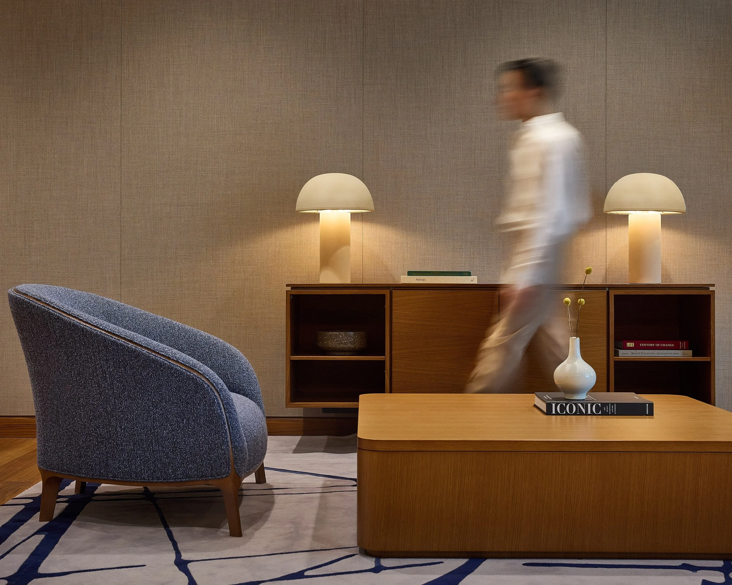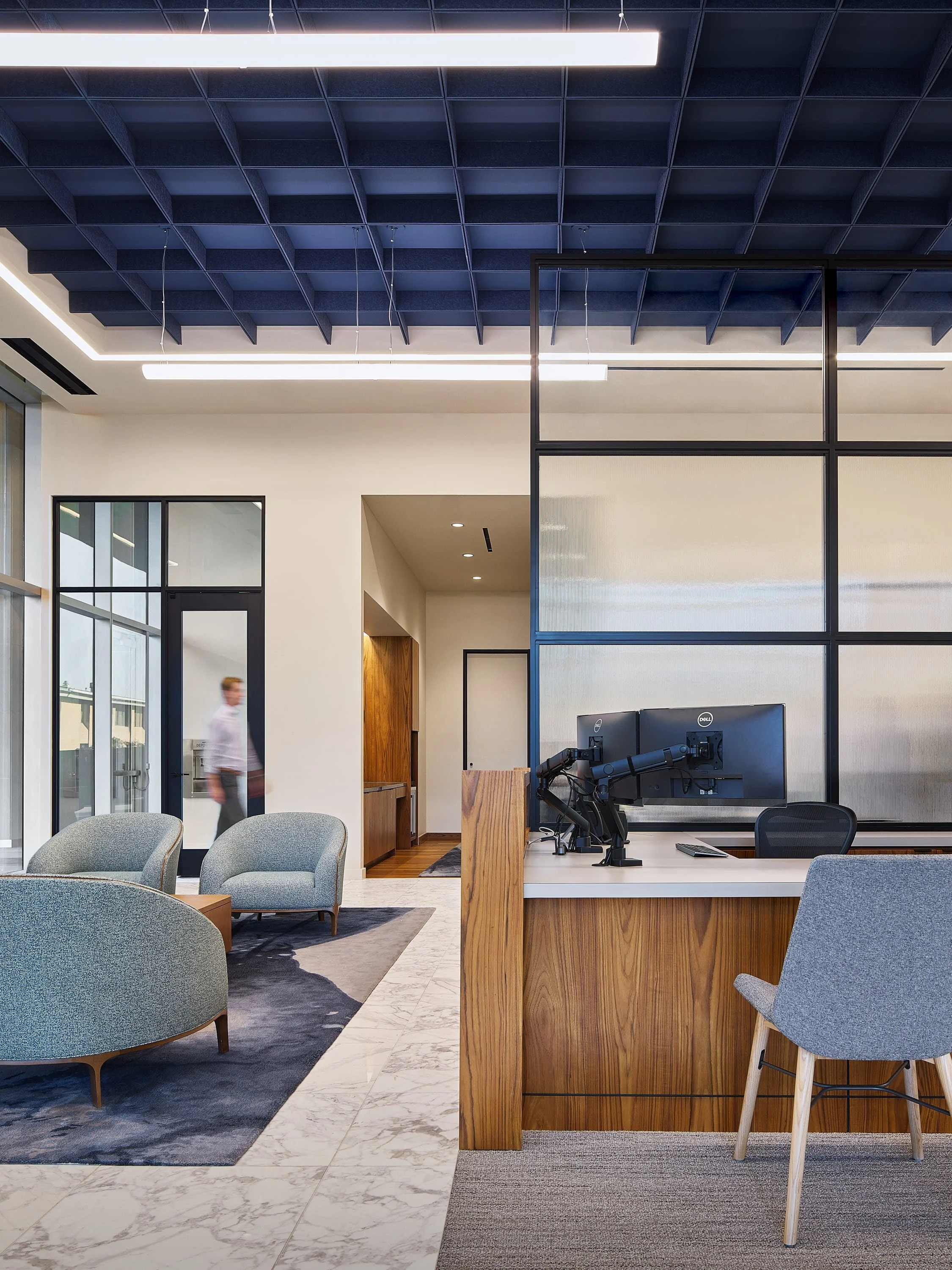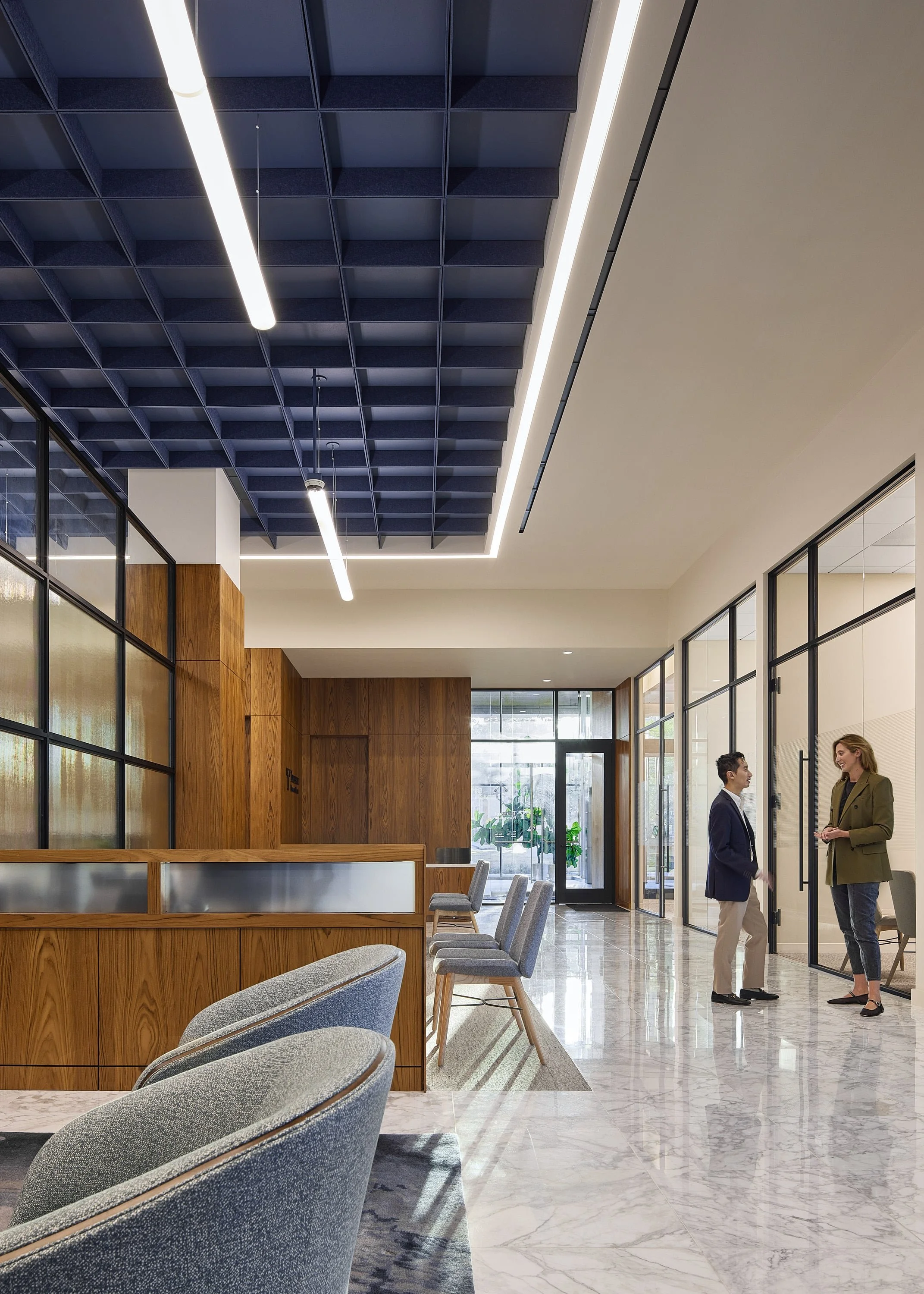 Designed with both clients and employees in mind, the layout includes a welcoming reception area, flexible conference rooms, and elegant lounge spaces. Warm wood tones, natural light, and high-end finishes establish a sense of calm and confidence throughout the office. Carefully integrated technology supports daily operations while maintaining a seamless aesthetic.