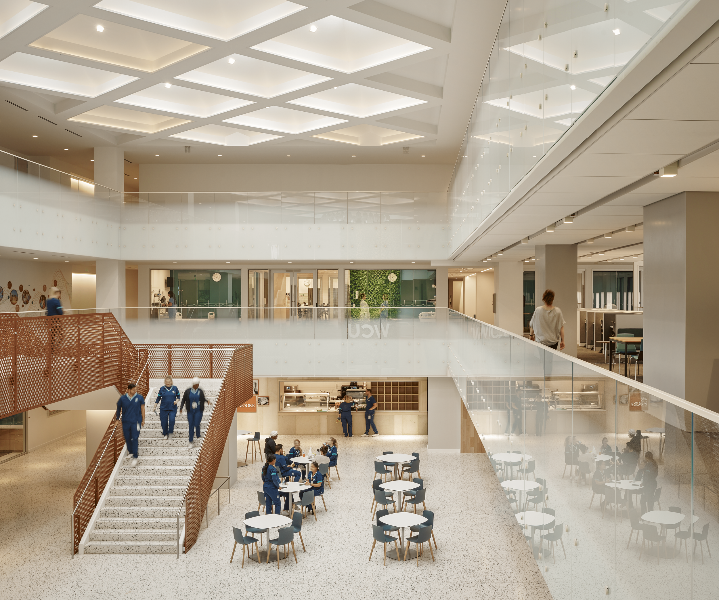 At the heart of the space is a soaring three-story atrium, anchored by a sculptural interconnecting stair that encourages movement, collaboration, and visibility across campus. Gensler’s design integrates a biophilic material palette of Texas limestone, copper-toned finishes, and a living green wall, reinforcing WCU’s focus on health and scientific discovery. A custom EKG wave detail at reception nods to the school’s mission, while amenity-rich common areas and flexible classrooms support an elevated student experience.