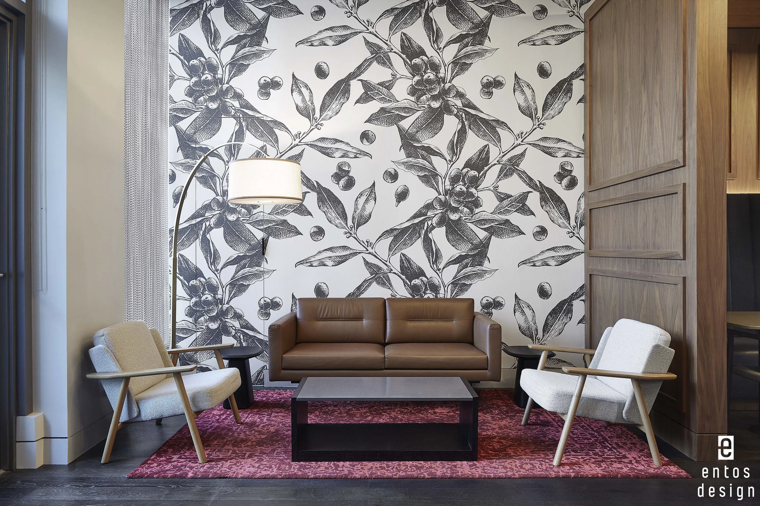 Designed by ENTOS, the café features a poured terrazzo island, sealed concrete floors, and sweeping views of downtown Dallas. A central conference room anchors the footprint, enclosed in 10-foot glass walls with u-channel frames and softened by fabric acoustic panels, creating a space that’s both modern and comfortable.