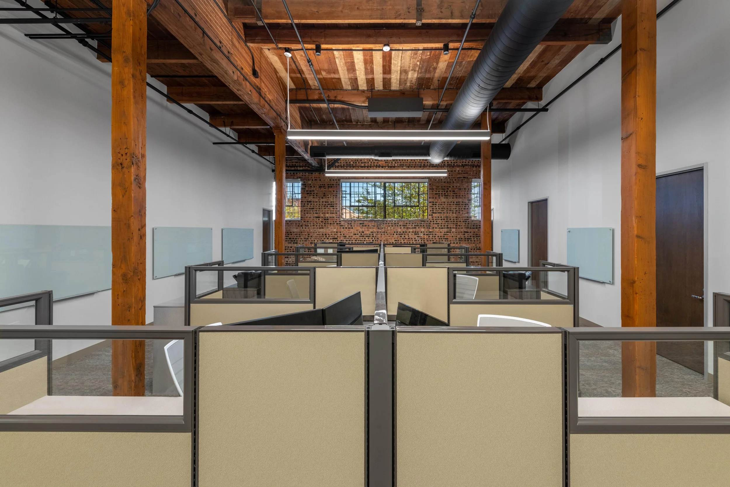 Witherite Law Group partnered with HRNCIR to bring their Fort Worth office to life inside a distinctive historic building. The goal: honor the existing architecture while creating a modern workspace tailored to the firm’s needs. Exposed brick, structural timbers, and original wood ceilings remain key features, balanced by elevated finishes and refined details.